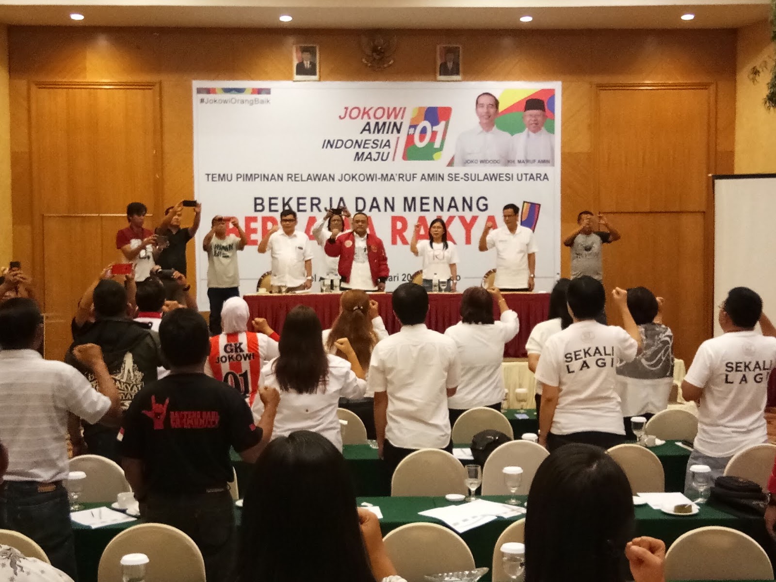 Jurnal,Manado - Pemilihan Presiden dan Wakil Presiden (Pilres) Republik Indonesia (RI) hanya tinggal menghitung hari. Untuk itu tim pemenangan Jokowi - Ma'ruf Amin terus melakukan konsolidasi baik ditingkat daerah maupun nasional. Seperti, Sabtu (9/02/2019), bertempat di salah satu hotel di Kota Manado, ratusan relawan Jokowi - Ma'ruf Amin Sulut atau disebut Tim Kampanye Daerah (TKD), penggabungan seluruh relawan se - Sulut berkumpul bersama untuk membahas langkah - langkah dan strategi pemenangan.